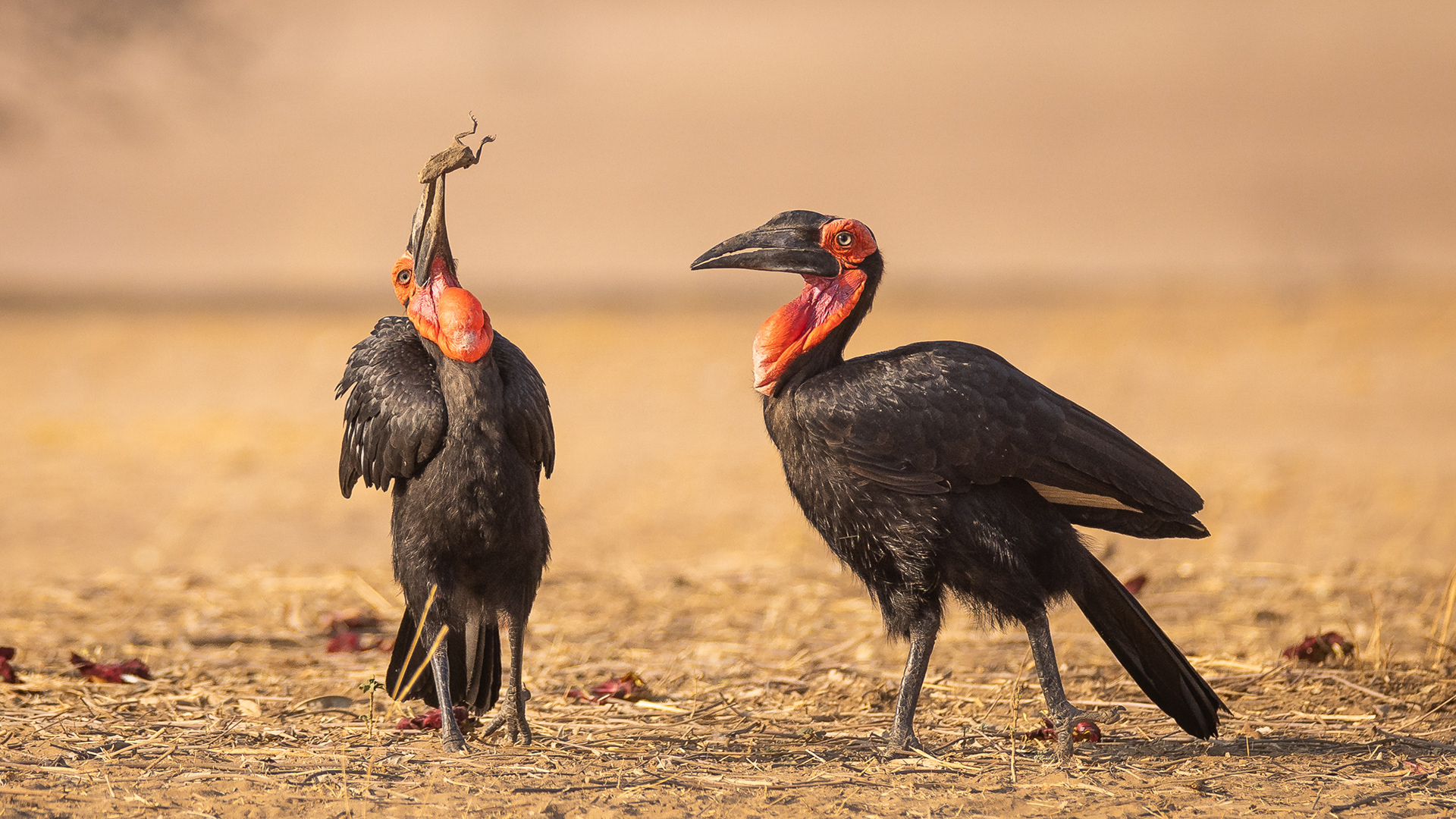 Last day today in the South Luangwa region so an early morning drive where I watched four Ground Hornbills walking around looking for insects and lizards. This male is parading proudly showing off his prize morsel to the others.