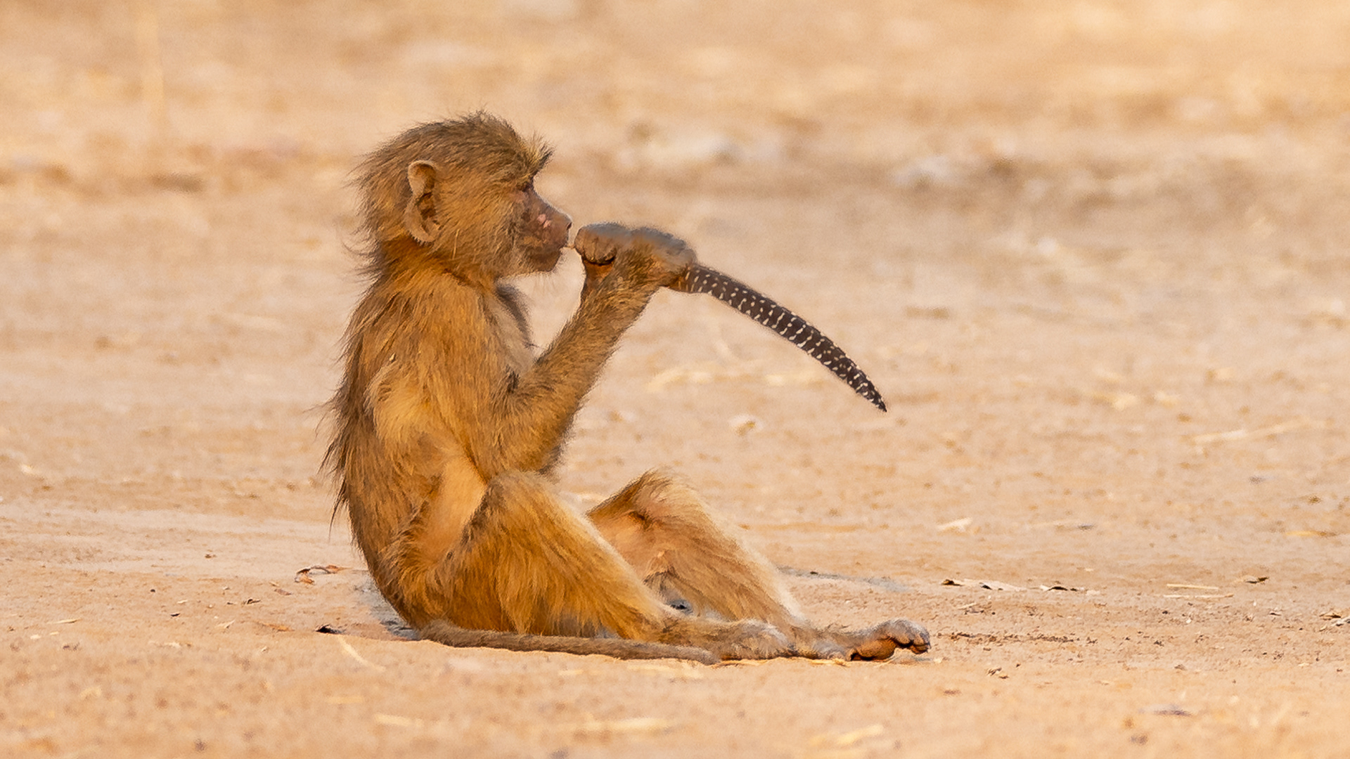 A young baboon with a toy. In this case the feather of a guinea fowl which he will show off to the other youngsters until such time that an older, bigger guy takes it off of him - just like our school playgrounds with the bullies.