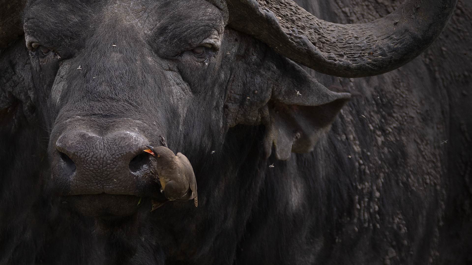A juvenile Yellow Billed Oxpecker delving into the orifices of this buffalo picking up ticks, maggots and flies as it holds on with strong claws and its long tail.