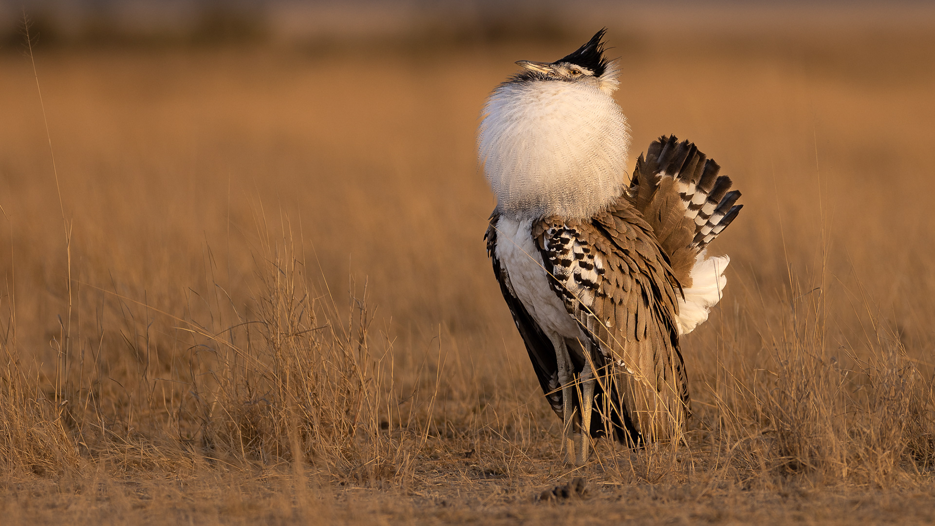 The picture today is a male Kori Bustard standing in full mating plumage awaiting a ljdyfriend. He will stand for many hours in the same place in expectation.
